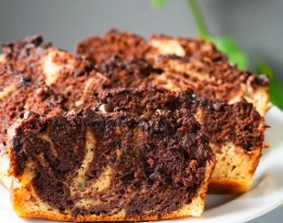Mettez la pâte blanche dans un moule à cake, puis ajoutez la pâte au chocolat par-dessus. Mélangez délicatement avec une cuillère à soupe pour faire le marbré (voir ma vidéo).